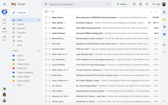 Nowy wygląd Gmaila to przede wszystkim przeprojektowanie paneli znajdujących się po lewej stronie ekranu i nieznaczna zmiana kolorów, po której interfejs c wydaje się bardnyej. Główna modyfikacja dotyczy rozmieszczenia skrótów do czatu oraz aplicacji Spaces i Meetsktóre w obecnej wersji interfejsu Gmaila są nieco „na siłę” dołączone pod panelem skrótów niezbędnych do obsługi poczty.