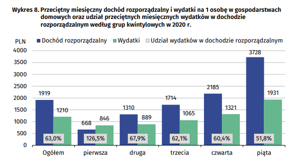 Să ne întoarcem acum la veniturile celor foarte bogați ai comunității. Inițial veniturile polilor au crescut, dar am scris la început că inegalitățile au crescut. Răspunsurile la ceea ce poate părea la început paradoxal trebuie căutate tocmai în veniturile săracilor. Din același studiu al venitului gospodăriei, vom afla cât de mult este cheltuit pe veniturile lor de către grup pe chintal. Grupa 20 la sută în primul chintal. Polii săraci. În al cincilea rând – 20 la sută sunt bogați. Per total, gospodăriile poloneze cheltuiesc 63 la sută pe lună. Venitul tău disponibil. Între al doilea și al cincilea grup chintal, acest procent scade constant – de la 68 la sută. În al doilea rând, până la 52 la sută. În al cincilea. Primul grup – adică 20% dintre săraci – este separat de celelalte printr-un defileu.