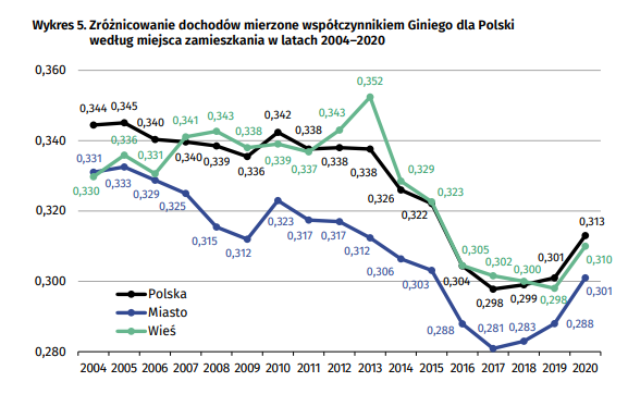 Avem cea mai mare creștere a inegalității din ultimii ani. Odată cu introducerea programului 500+ și scăderea accentuată a inegalității, suntem aproape de a reveni la nivelul 2015. Astfel de concluzii pot fi extrase din cel mai recent sondaj anual al bugetului locativ al Biroului Federal de Statistică. Conform aceluiași studiu, vedem că până în 2020 venitul mediu disponibil lunar al unei persoane va fi crescut cu 2%. Astfel, dacă veniturile vor crește și inegalitățile vor crește în populația generală – cei săraci ar trebui să sufere grav după criză.
