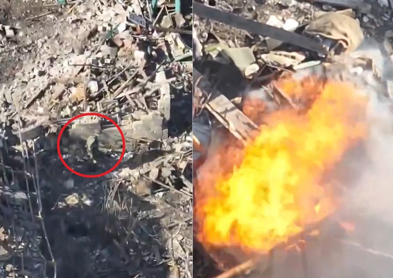 Videoclipul arată cum o dronă a văzut un soldat rus mergând printre dărâmături. La un moment dat, s-a ascuns într-un buncăr acoperit cu moloz. Cu toate acestea, înregistrarea arată clar locația intrării. Probabil era un subsol sub o clădire prăbușită.