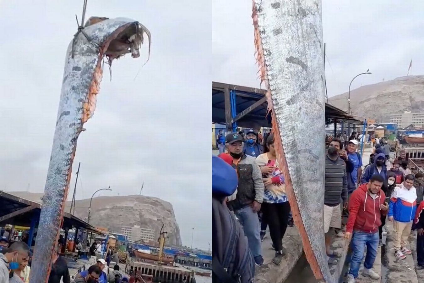 Peștele uriaș a fost prins în orașul Arica din nordul Chile. La aproximativ 6 metri, creatura a fost trasă la mal cu o macara. Locuitorii s-au adunat în jur pentru a privi cu atenție peștii argintii.