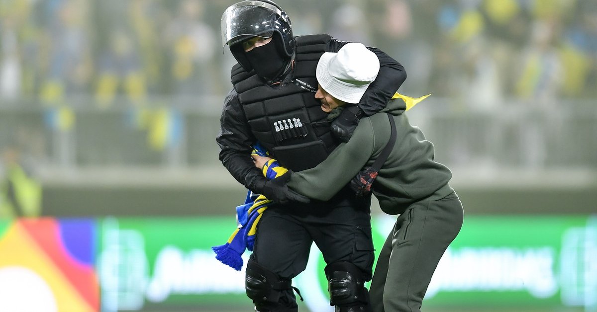 Scenele neplăcute au avut loc după încheierea întâlnirii Societății Națiunilor dintre Ucraina și Irlanda. După fluierul final al arbitrului, zeci de suporteri au fugit pe teren, iar situația a început să scape de sub control. Una dintre rudele fanilor a dat foc de artificii, iar alta a vrut să facă o fotografie cu un actor ucrainean.