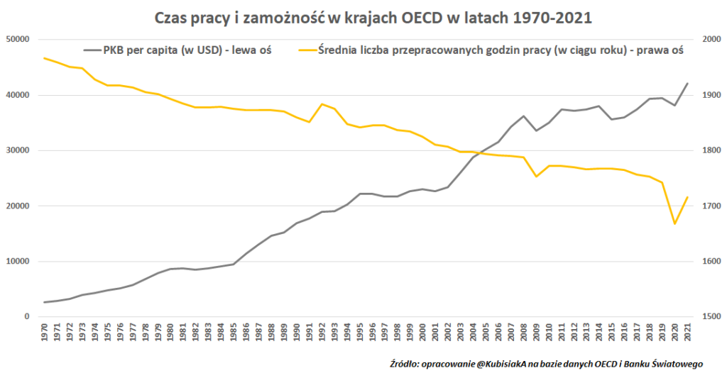 Kubisiak a postat un grafic pe Twitter, care aduna curba orelor medii lucrate anual și PIB-ul pe cap de locuitor pentru anii 1970-2021 în țările OCDE (38 de țări foarte dezvoltate, inclusiv Polonia).