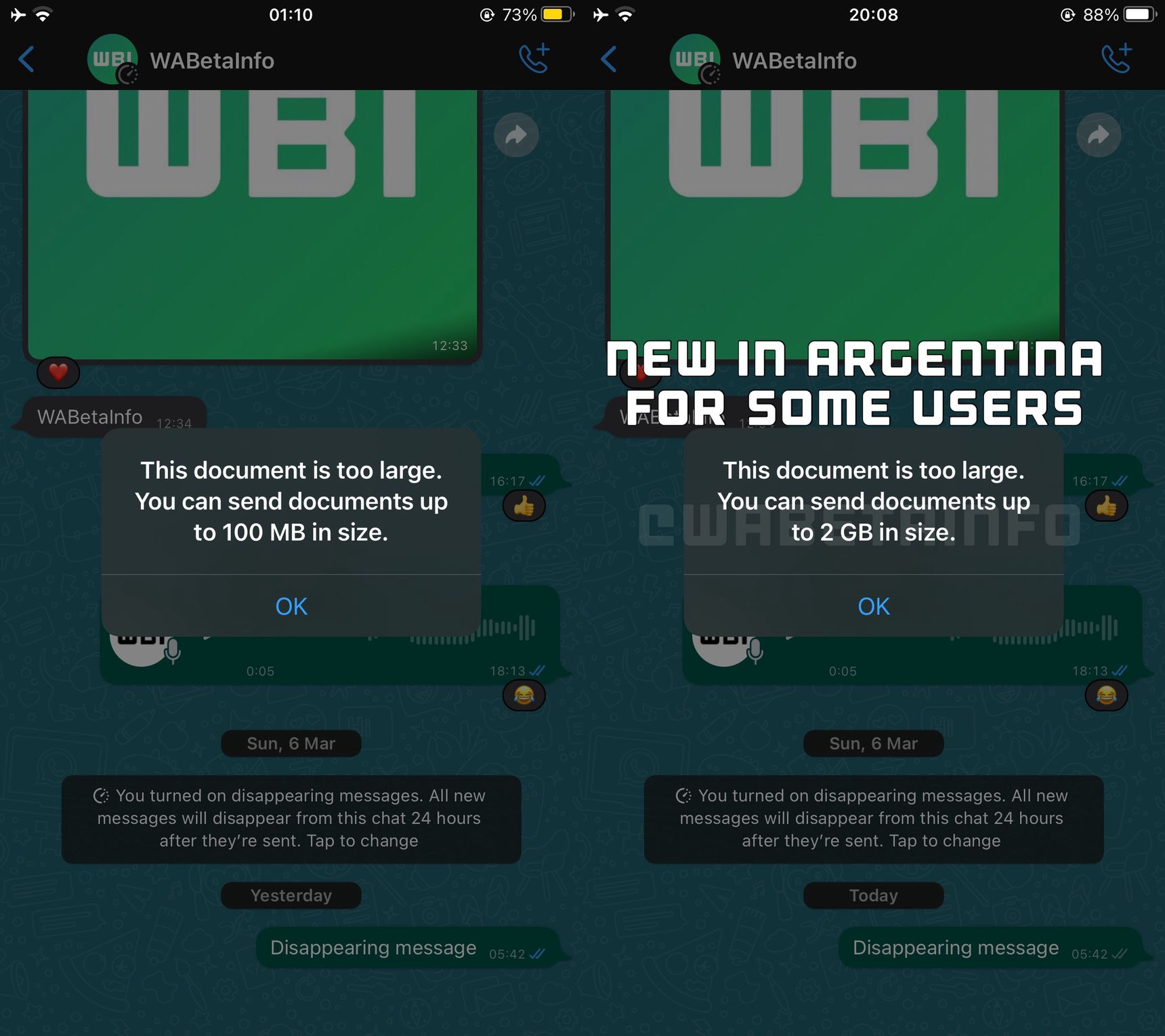 În timp ce pentru documentele tipice încărcate zilnic, limita actuală este de 100 MB în format . WhatsApp Asta nu ar trebui să fie o problemă, creșterea cotei la 2 GB poate ajuta cu siguranță. Va fi util atunci când trebuie să trimiteți fișiere PDF cu grafică excepțional de lungă și bogată sau alte atașamenteNu poate fi ambalat suplimentar sau împărțit în loturi mai mici.